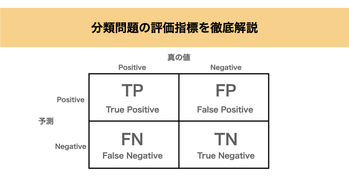 まずは、出力が「Positive / Negative」の2値(例:スパム or 非スパム、病気あり or なし)の場合に使用される評価指標について説明します。